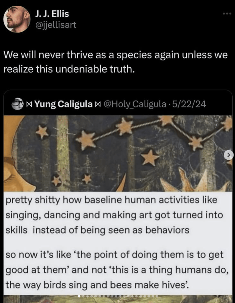 Normally an instagram post of a tweet that’s quote tweeting another tweet that’s just a screenshot of a quote is how I know I’ve gone too far down the rabbit hole of the internet – it’s like getting advice from your friend’s sister in law’s cousin’s nephew, far too removed from the source to be of much use. But the quote above is so broad that it still works, and it coincides somewhat with theories of posthumanism and queer negativity I’ve been reading in another book (the name of which I’ll wait to mention until I’m done with it and can write a review here). I want to stop trying to get good at things, and instead just do the things. If I get good at them, fine. The main point is that I want to remember to make art or write or stare at the ceiling for the sake of the thing itself and not an improvement of my abilities, which is such a blatantly capitalist notion that it must have been planted in my head by Henry Ford or John D Rockefeller themselves.